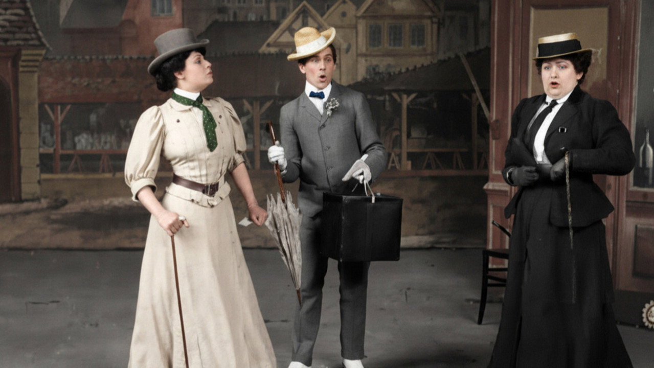 A subtitle warns, "beware of dark sunglasses." Anna and her lover, whose looks in bowler and bow tie are reminiscent of a young Buster Keaton, kiss chastely on a bridge overlooking the Seine. He dons sunglasses and waves as she runs down a stairway to the river's edge, then watches in horror as she's knocked flat and loaded into the back of a hearse. In vain, he gives chase. Disconsolate, he buys a large funeral wreath and a handkerchief from sympathetic vendors. He removes the glasses to wipe his eyes and realizes they are the cause of all his woe. He replays the farewell without the glasses.