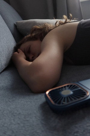 A woman sleeps to the sounds of a summer rain.