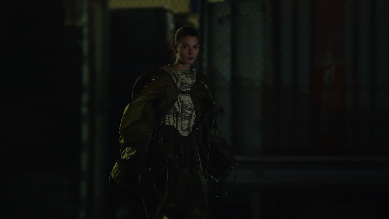 A young woman is pursued by shadowy figures as she attempts to escape her slave-like conditions at a dystopian factory.
